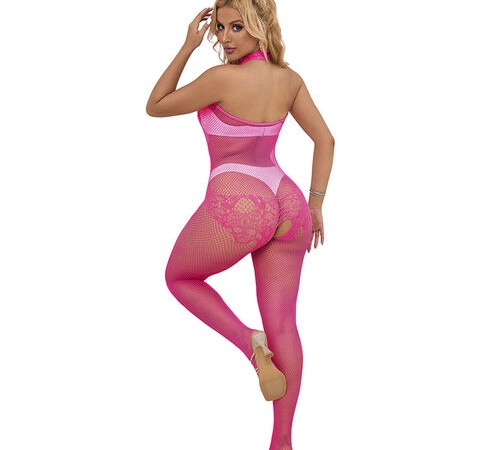 BODYSTOCKING CROTCHLESS DE REJILLA Y ENCAJE CON CUELLO ALTO ROSA TALLA ÚNICA